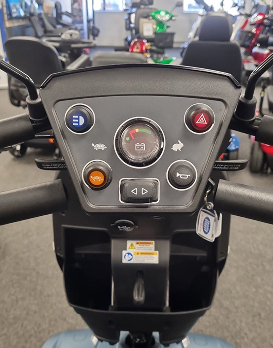 We are pleased to offer you this 3 month old 8 mph scooter in titanium blue, with exceptional legroom, comfort and performance, excellent ground clearance, perfect scooter for the active person.